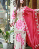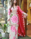 Short shirt with drape skirt Available in two colours Yellow Pink Handwork on dupatta and neck.